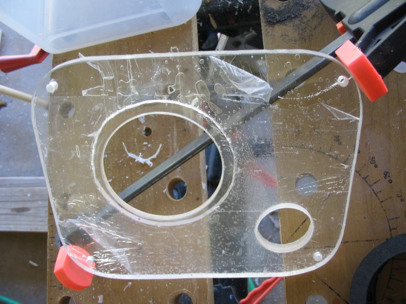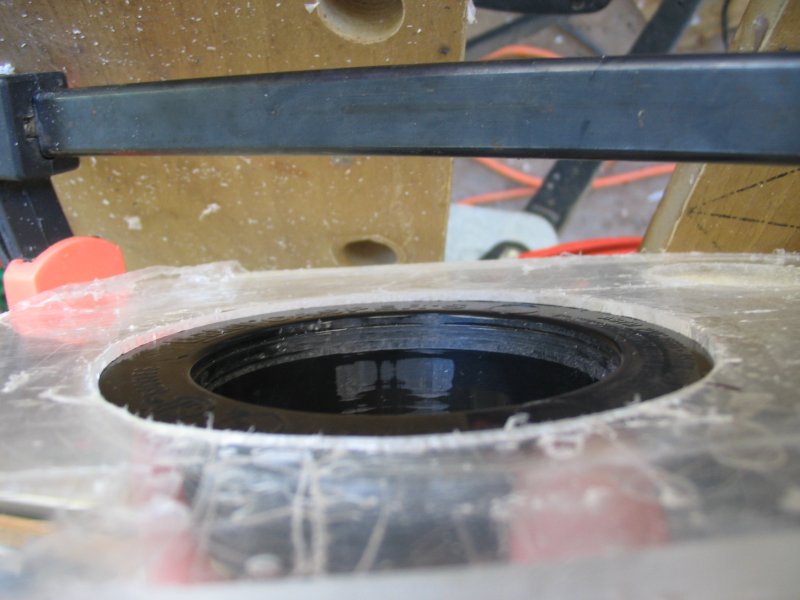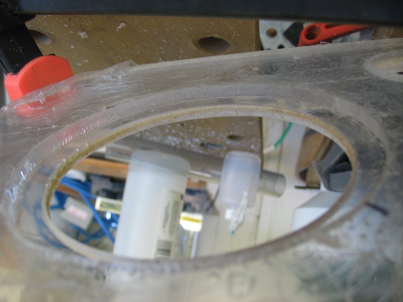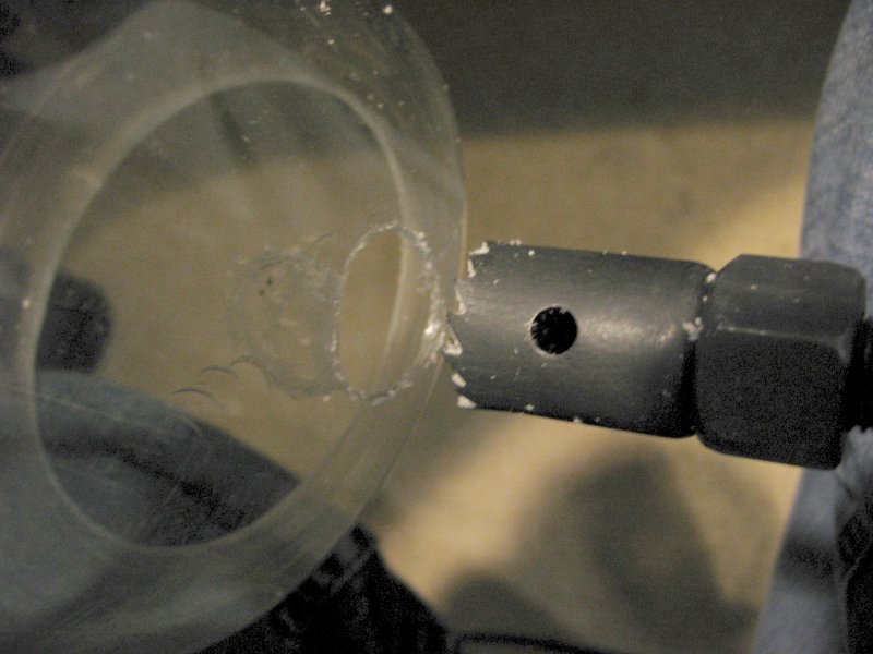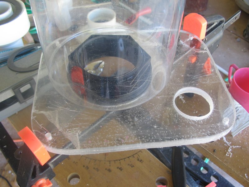 I cut two concentric circles of different sizes in the two identical sheets of acrylic. One hole was 3.5". The other 5". After cutting I bonded the two sheets together using Weld-on 4. Finally I drilled a single hole through both sheets for the foam jet inlet bulkhead.
