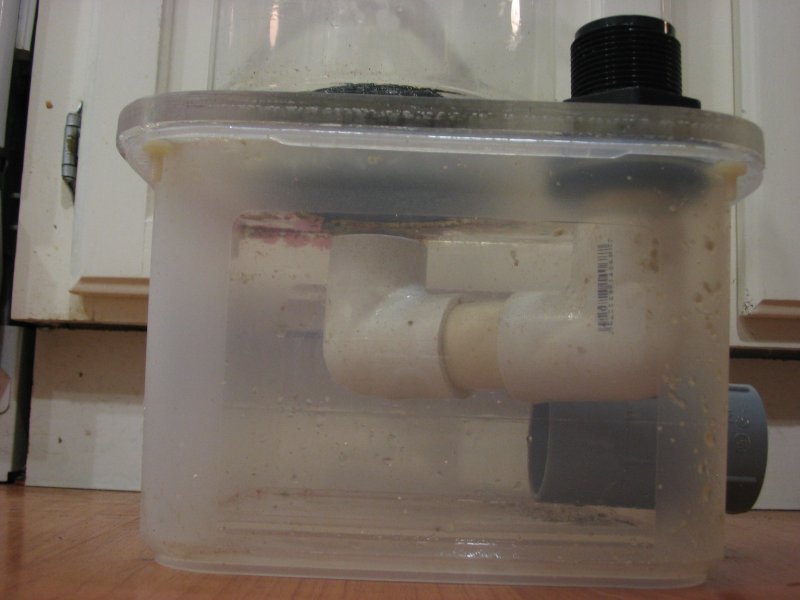 This is the Sterite brand "Show off" container. I just drilled a hole through the side and added the drain. The connection here is the two elec. PVC fittings screwed together. Although Ihave one, you don't really need an o-ring on this fitting for water tightness, since a tiny leak here won't kill you. Remember this is an in sump skimmer.