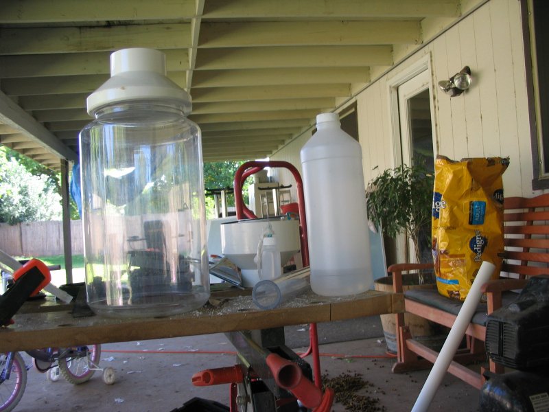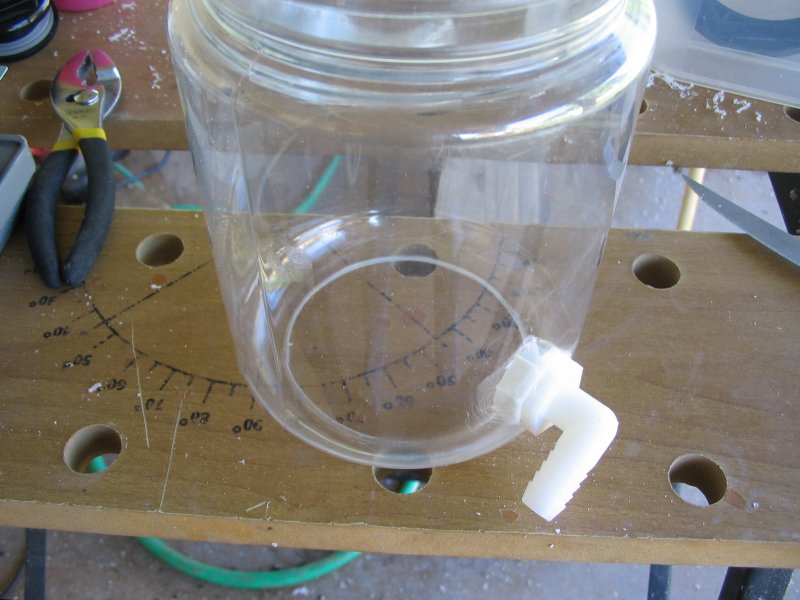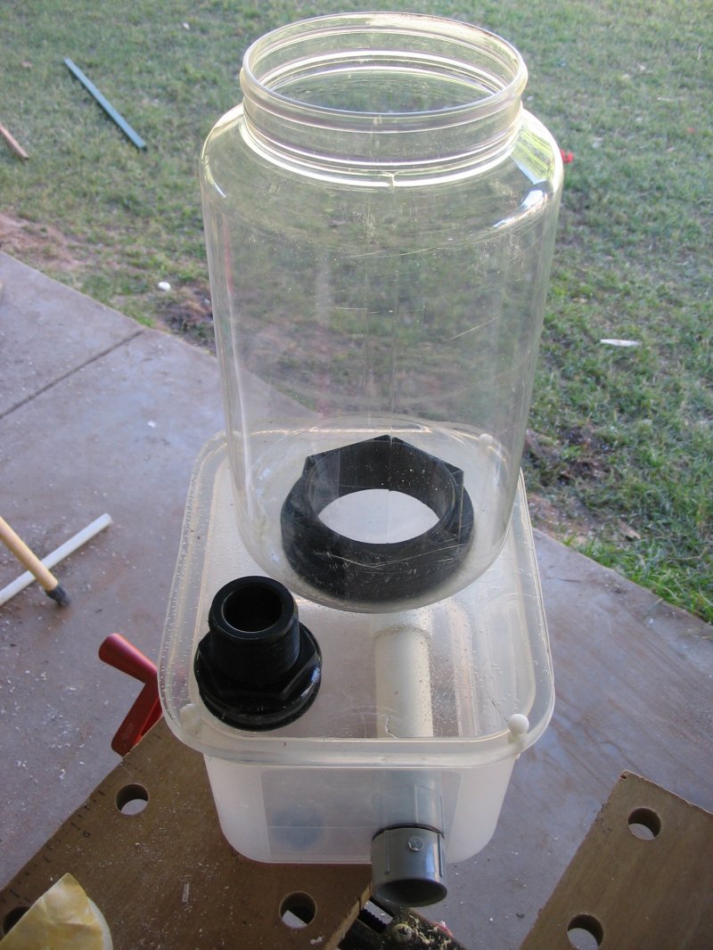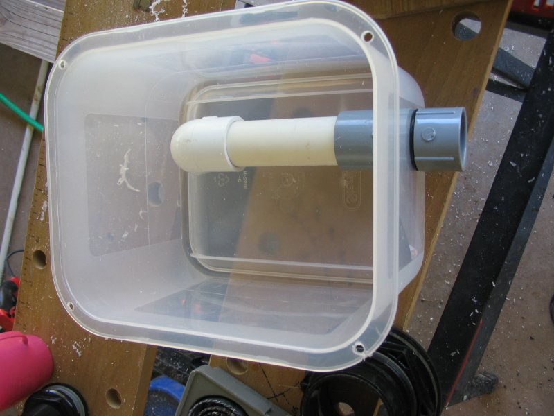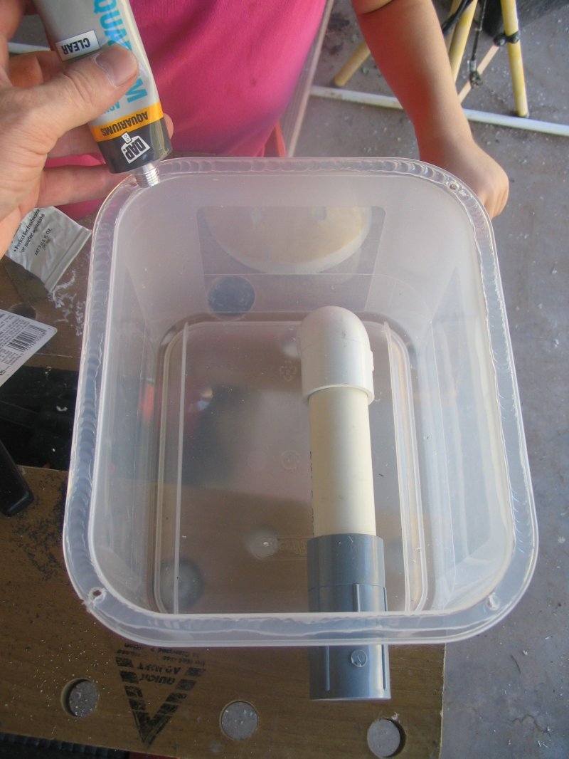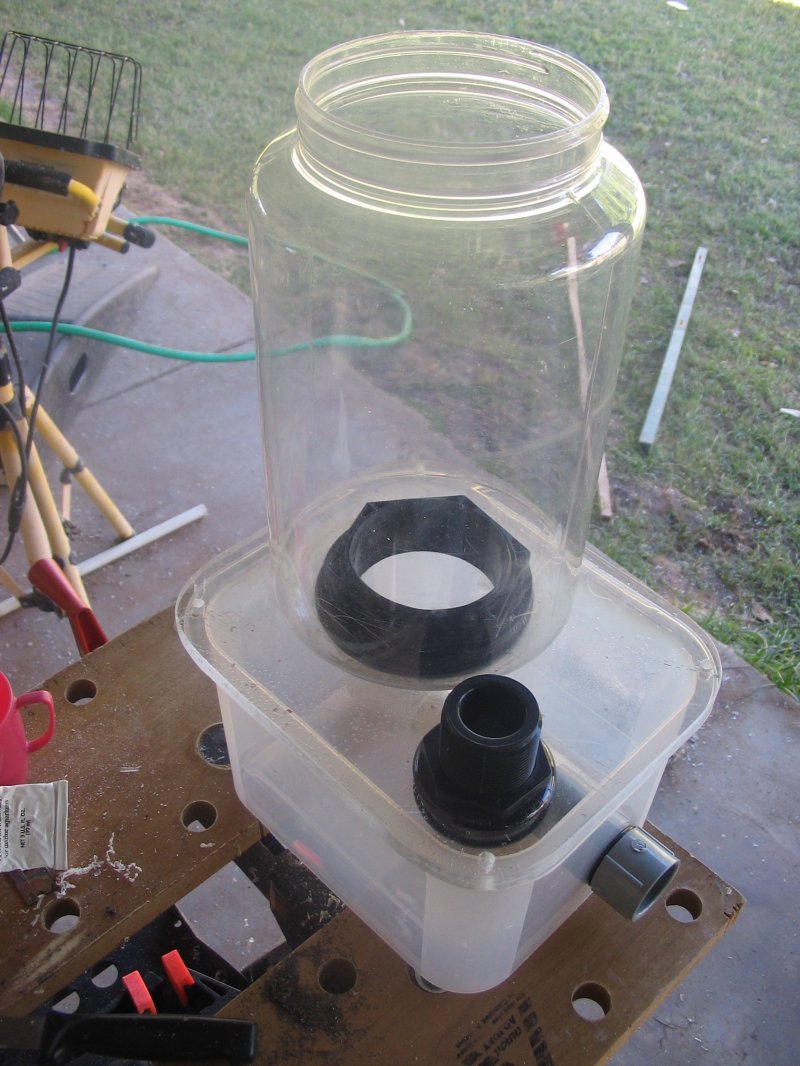 The collection cup is made from a 2 Quart Rubbermaid(TM) food container. I assume you have already drilled the 3.5" hole in the bottom of this container in a prevous step. If you want a skimmer cup drainline it's cheap and easy to add.