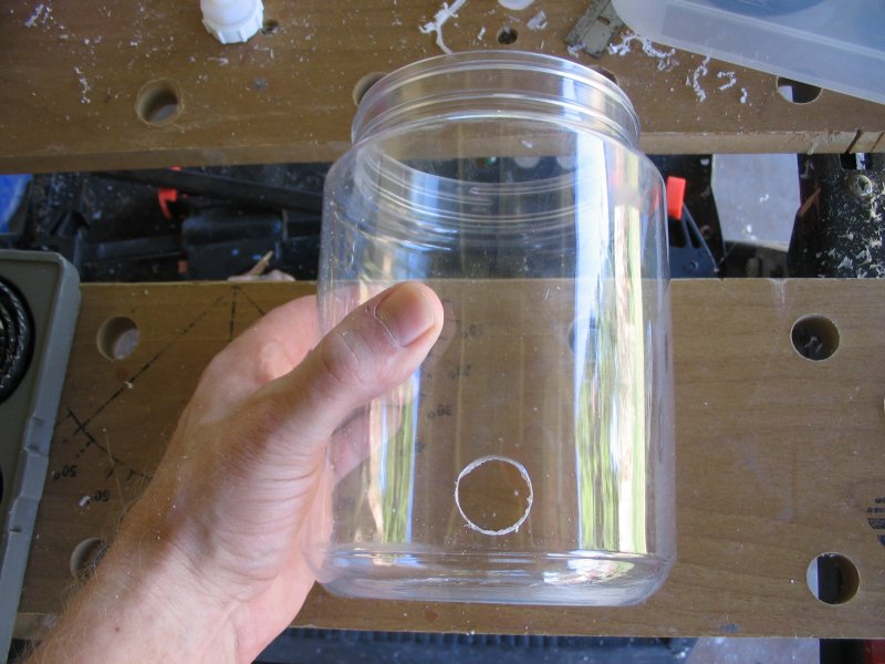 This is actually an image of the skimmer cup(2 quart food container). I don't have one of the 1 gallon food container but the process is the same. Since you likely have everyting out, you might as well cut both holes at the same time - one in each container.