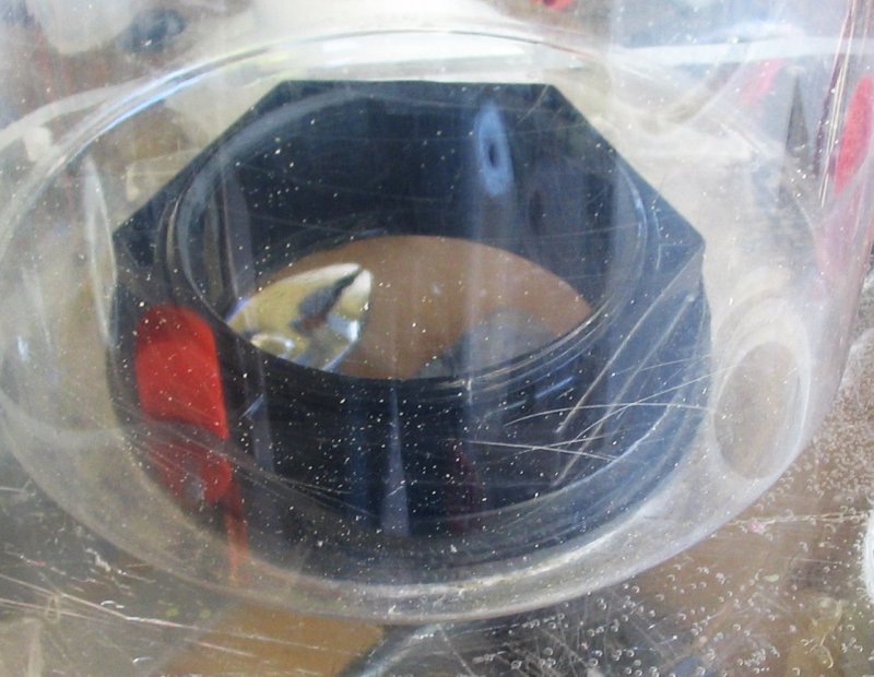 Here's a more detailed shot of that the lid inside the adapter. In roughed up the inside surface of the PVC adapter with sand paper and glued the lid in with silicone.