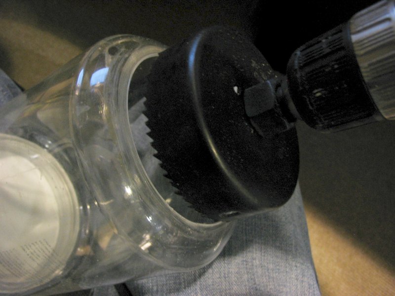 First drill a tiny hole (1/8") in the center bottom of the food container. Using this as pilot hole cut the 3.5" hole in the bottom using a hole saw.