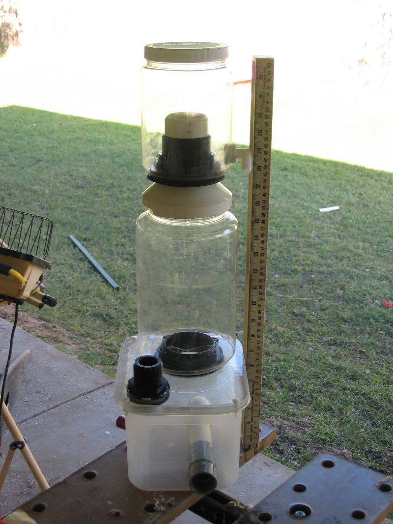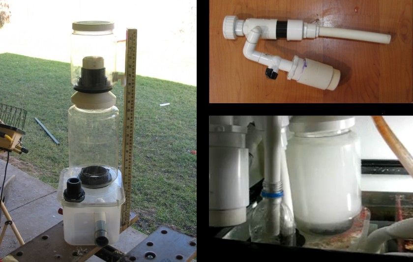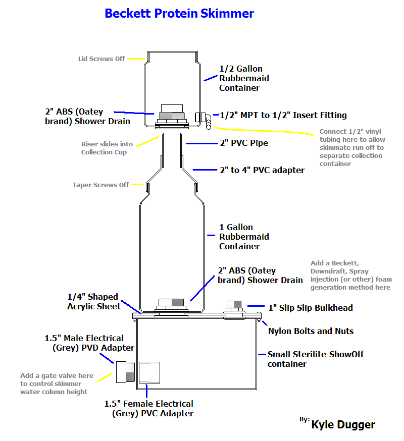 One thing that you have to have for a skimmer is visibility - especially if you are going to design your own. To determine whether your efforts have been successful, how are you otherwise going to determine whether your design is effective? What's is going on inside? Is it too turbulent? How many bubbles are being generated. How small are they. How do you tune it, let alone see if what you built worked? It (or at least most of it) has to be made from transparent material. This was the flaw of most PVC skimmers as well as having a limited diameter of pipe and fittings(4") that is readily available at the local hardware store.